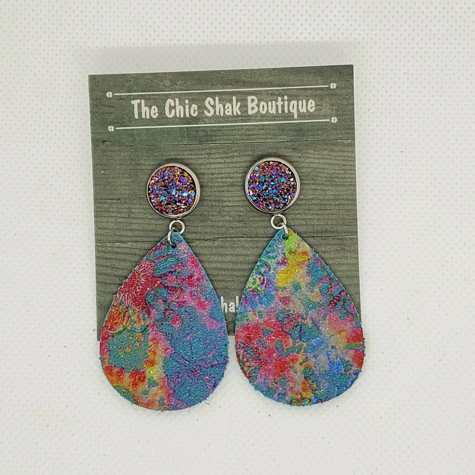- 2" Aqua Tie Dye Leather Teardrops w/Rainbow Metallic Studs