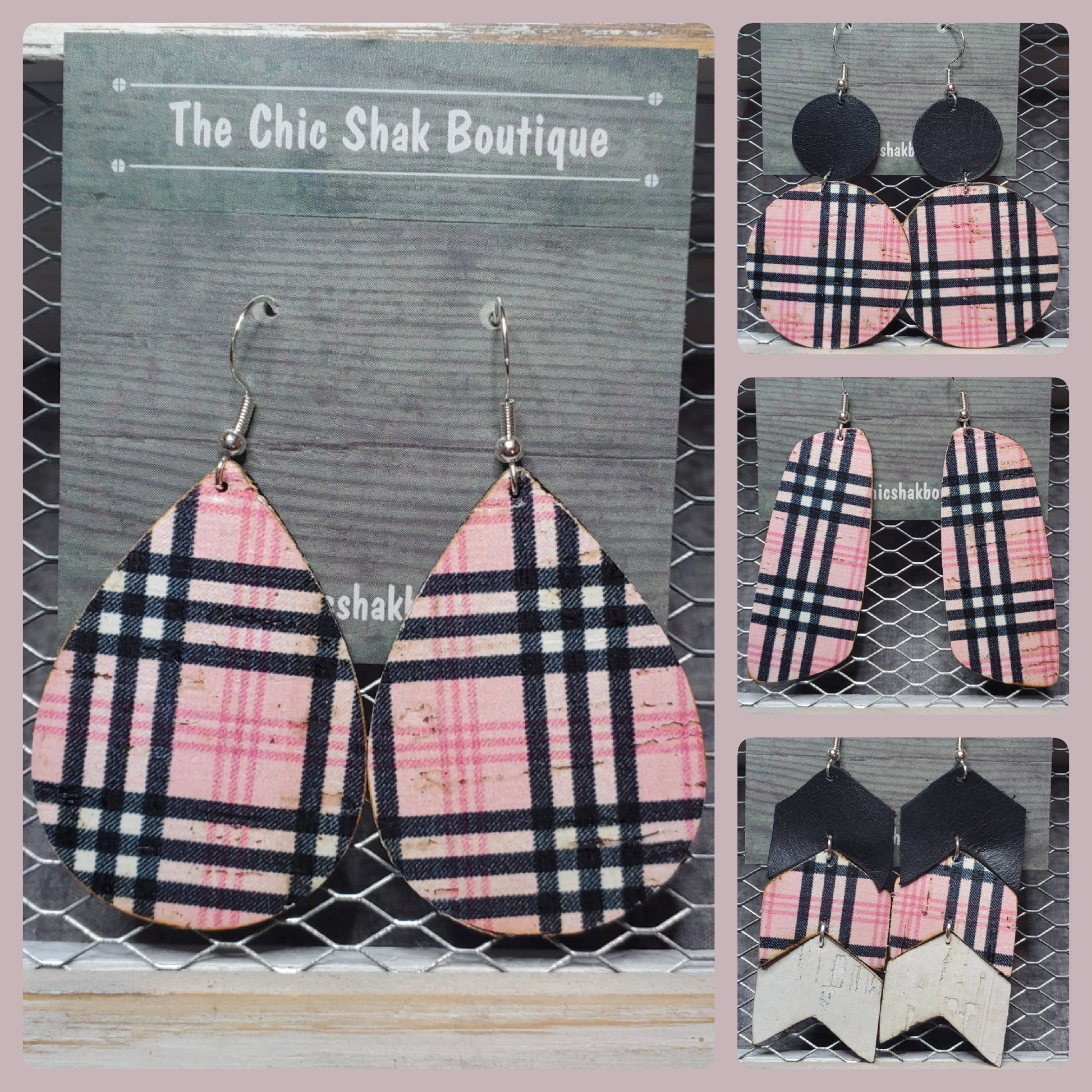 * 2.5" Black & Pink Plaid Cork/Leather Teardrops