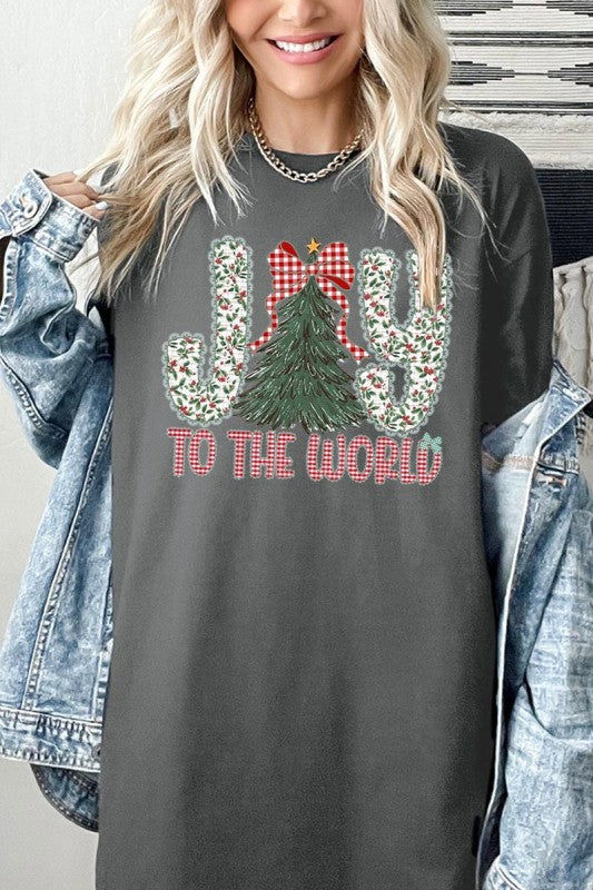 joy to the world tee, christian christmas shirt, plaid christmas tree top, faith based tee, christmas joy shirt, holiday praise top, nativity inspired tee, merry bright shirt, christmas blessing Graphic Plus Size Heavy Cotton Tee.