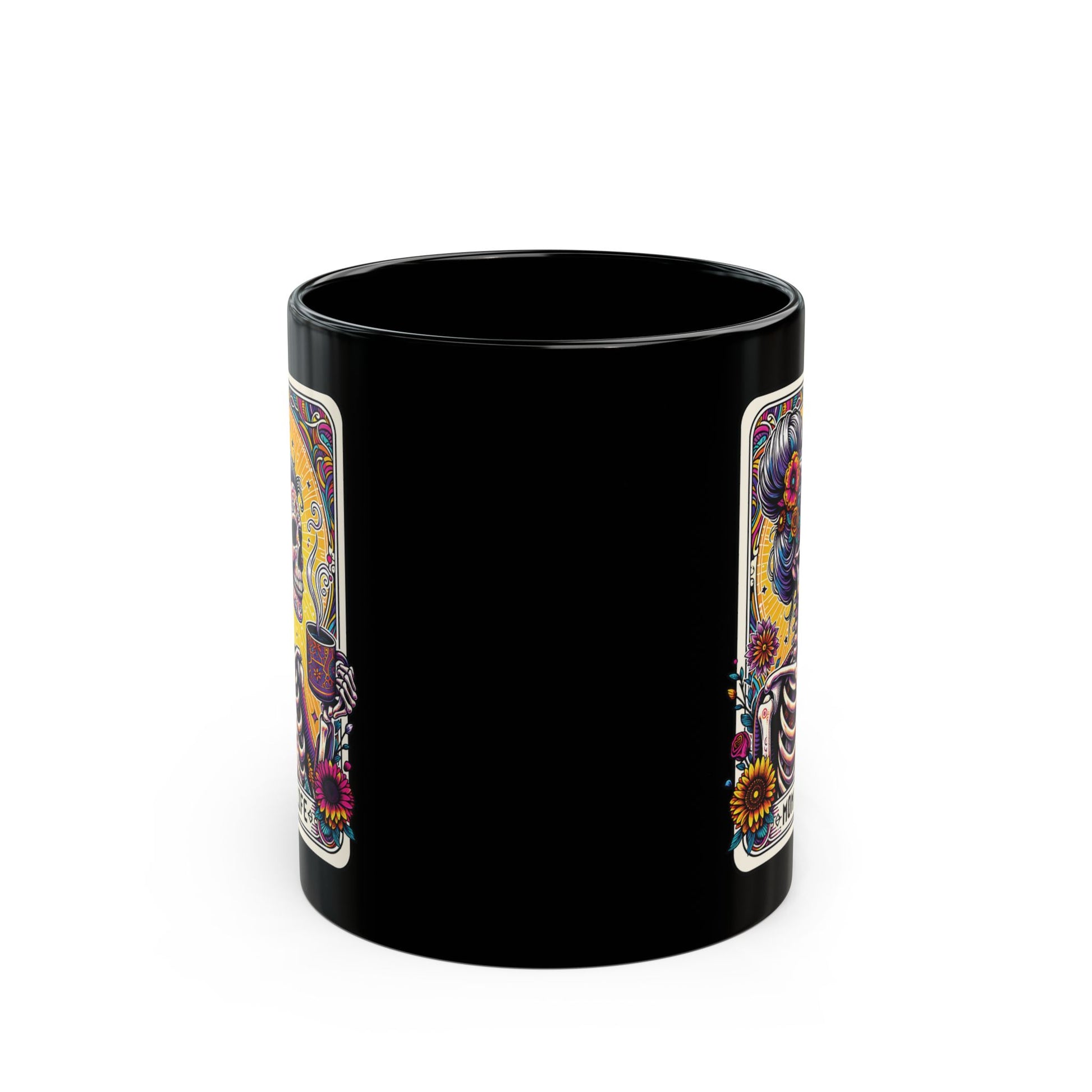This glossy black ceramic mug brings a bold, colorful Day of the Dead–inspired scene into everyday ritual. Bright, crisp printing wraps a lively skeleton figure framed by sunflowers and swirling decorative patterns — she lifts a steaming cup with the banner reading “MOM LIFE.” The contrast between the deep black glaze and vivid artwork makes each detail pop, turning a simple morning coffee into a little celebration. Durable, microwave- and dishwasher-safe construction means the mug travels from sleepy kitchen to busy office without fuss. For someone who appreciates quirky, expressive art and wants a mug that feels personal and a little rebellious, this keeps the mood playful while staying practical.