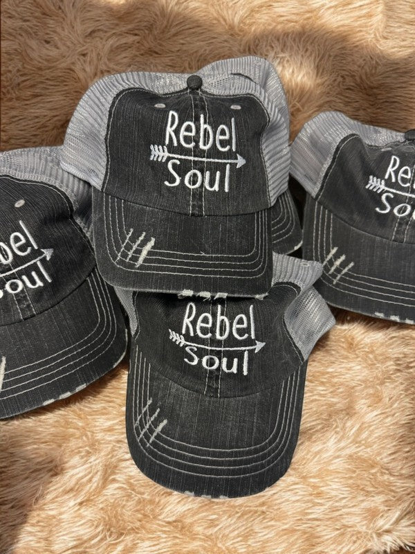 Rebel Soul Embroidered Trucker Hat with mesh back and velcro closing.